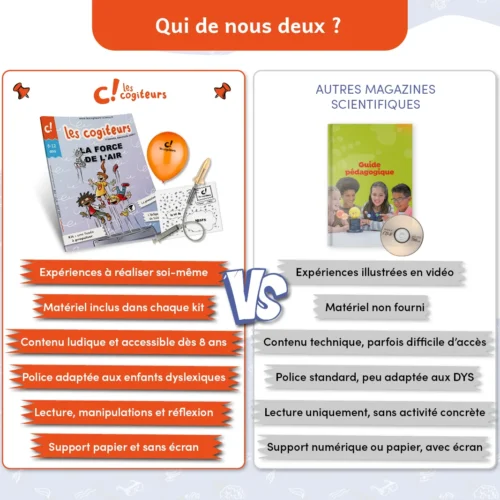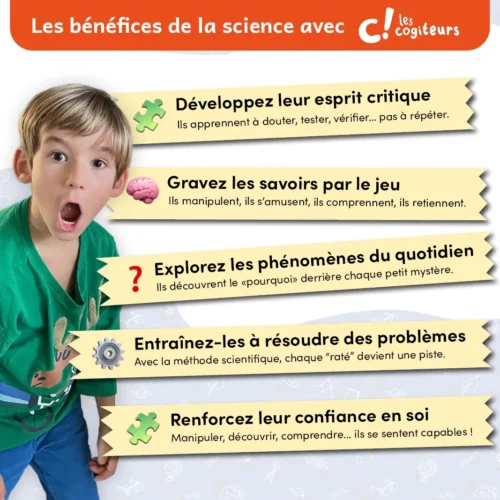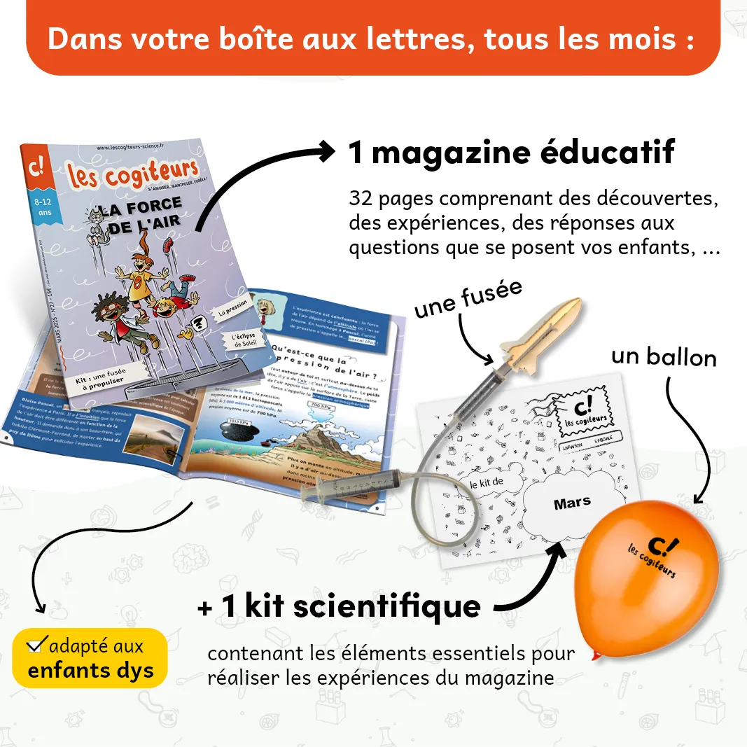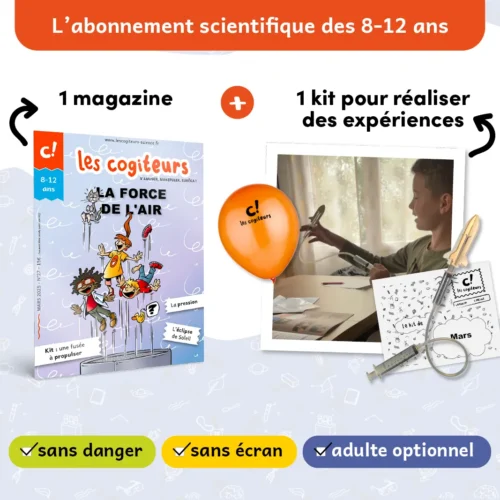 L’abonnement aux kits scientifiques des Cogiteurs garantit à vos enfants de percer chaque mois un peu plus les secrets du monde qui les entoure en abordant un grand principe scientifique, que ce soit lors d’un moment de partage avec la famille ou de manière autonome.